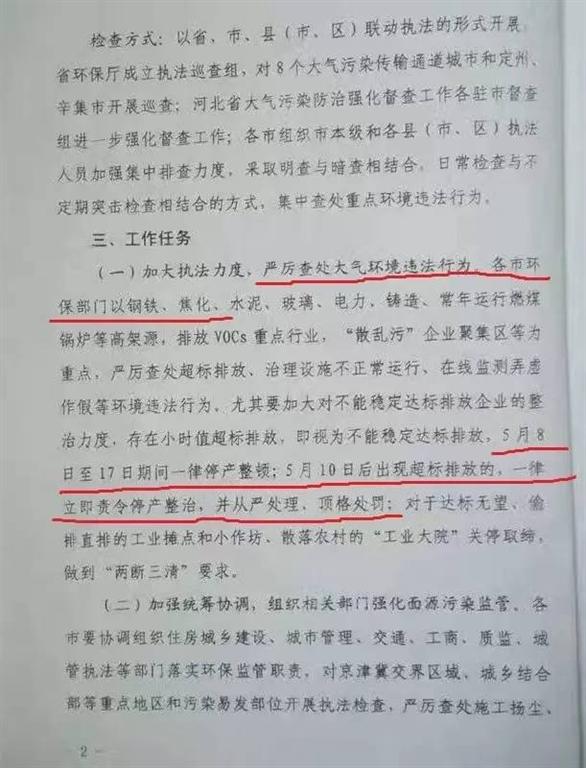 3、主要內容:加大執法力度,嚴厲查處大氣環境違法行為,各市環保部門以鋼鐵、焦化、水泥、玻璃、電力、鑄造、常年運行燃煤鍋爐等高架源,排放V0Cs重點行業,“散亂污”企業聚集區等為重點,嚴厲查處_標排放、治理設施不正常運行、在線監測弄虛作假等環境違法行為,尤其要加大對不能穩定達標排放,5月8日至17日期間一律停產整頓;5月10日后出現_標排放的,一律立即責令停產整治,并從嚴處理,頂格處罰。