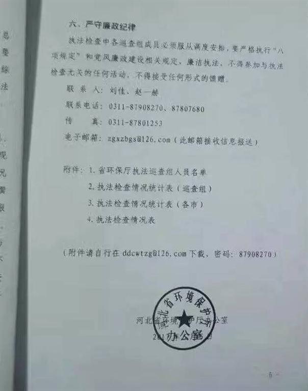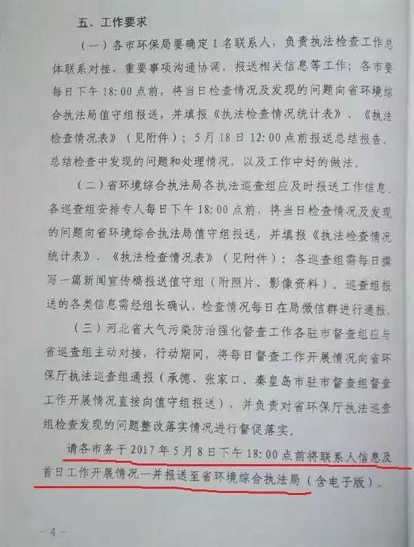 2、檢查方式及開展時間:于2017年5月8日—5月17日以省、市、縣(市、區)聯動執法,省環保廳成立執法巡查組,河北省大氣污染防治強化督查工作各駐市督查組,各市組織市本級和各縣(市、區)執法人員,采取明查與暗查及日常檢查與不定期突擊檢查相結合,加強集中排查力度,集中查處重點環境違法行為;