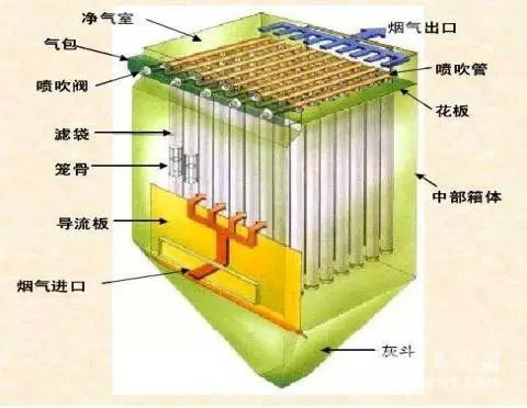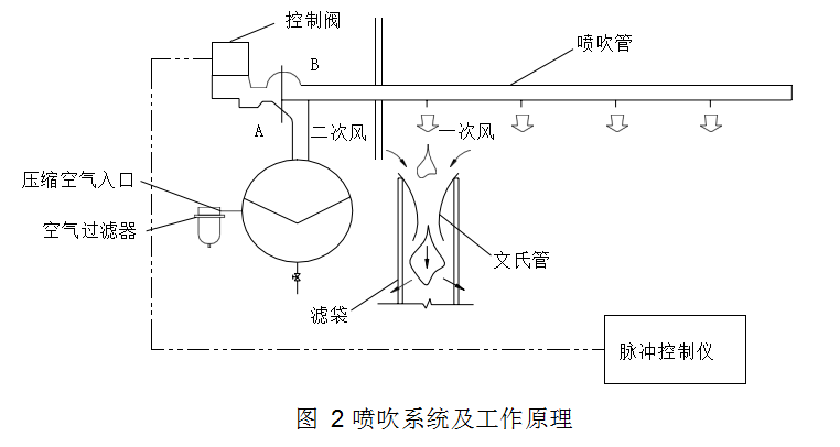 脈沖閥噴吹口處于半閉狀態(tài);當(dāng)控制儀發(fā)出信號(hào)時(shí)控制閥排氣口被打開脈沖閥背壓室的氣體泄掉,壓力降低、膜片兩面產(chǎn)生壓差,膜片因壓差作用而產(chǎn)生位移,脈沖閥噴吹口打開,此時(shí)壓縮空氣從氣包經(jīng)過(guò)脈沖閥經(jīng)噴吹管小孔噴至文氏管進(jìn)入濾袋(從噴吹管噴出的氣體為一次風(fēng))。當(dāng)高速氣流通過(guò)文氏管誘導(dǎo)數(shù)倍于一次風(fēng)的周圍空氣(稱為二次風(fēng))。造成濾袋內(nèi)瞬時(shí)正壓。實(shí)現(xiàn)清灰。