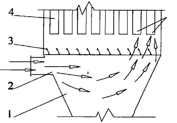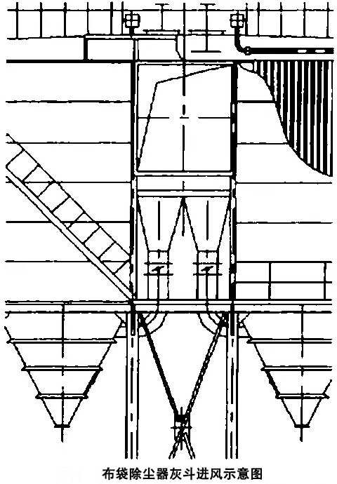 為避免上述情況,建議在條件許可時,盡量不采用灰斗進風。若不能避免灰斗進風,圖所示 的氣流分布裝置是一種可供選擇的方案,即在灰斗中設垂直的氣流分布板,置于含塵氣流之中,使 之正面迎向含塵氣流,以削弱過高的氣流動壓。同時,垂直的氣流分布板長短不一,布置成階梯狀,使含粉塵氣體均勻分散并且像素流動.時間證明,這種裝置有效的避免了含塵氣流對濾袋的沖刷