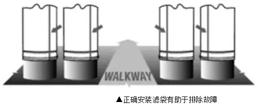 應(yīng)檢查折疊在支撐籠頂部的帶法蘭或袖口的布袋邊緣是否平滑,以防止泄漏和布袋磨損。底部裝載袋上的接縫應(yīng)與籠圈上的裂縫或間隙成180°。這些布袋上的夾子應(yīng)該相對(duì)于布袋上的接縫安裝90°,并且位于袋籠的凹槽中。頂部進(jìn)入脈沖噴射裝置的卡扣袋應(yīng)安裝在接縫全部朝向相同的方向。這樣可以識(shí)別發(fā)生問題的區(qū)域,并_設(shè)備的故障排除。