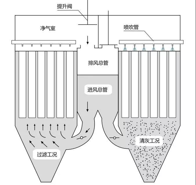 利用高壓氣體或外部大氣反吹濾袋,以振落和清理濾袋上的積灰。這種方法有包括反吹風(fēng)清灰/脈沖噴吹清灰和反吸風(fēng)清灰三種。其中常用的是反吹風(fēng)清灰方式,他是利用大氣或者風(fēng)機排出管道吸入氣體而形成反向氣流,利用反向風(fēng)速和振動,來使得沉積的粉層塵脫落。此清灰方式常用的是編織布濾料或使用過濾粘類濾料,容易清落的粉塵。反吹清灰方式的清灰作用比較弱,但要對濾布的損傷作用比振動清灰方式要小,所以,一些柔軟的濾料,如玻璃纖維濾布多采用這種清灰方式。