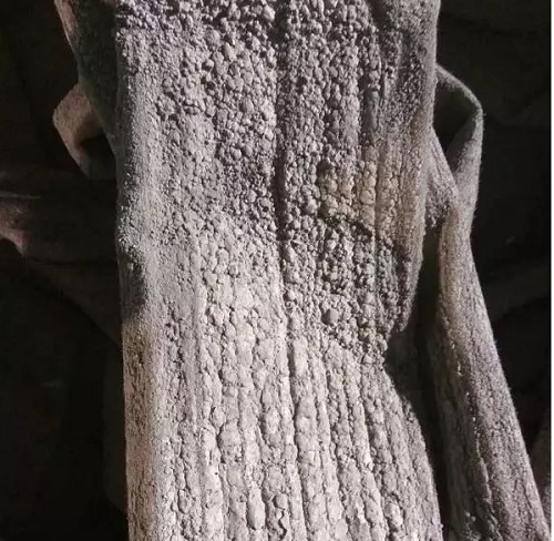 另一類使濾料受過(guò)高溫度作用,造成破損失效的情況發(fā)生在除塵器灰斗。當(dāng)灰斗積灰過(guò)高,甚至掩埋了濾袋底部,致使濾袋底部長(zhǎng)時(shí)間受高熱炙烤,_會(huì)造成濾袋破損。灰斗積灰過(guò)高通常發(fā)生在輸灰系統(tǒng)故障時(shí),也包括灰斗下灰閥失效、灰斗內(nèi)的灰無(wú)法下落、或者灰斗積灰棚架不能下落。但是如果灰斗設(shè)有高位料位計(jì),并料位計(jì)工作正常,這種狀況an全可以及時(shí)發(fā)現(xiàn)并處理,不會(huì)導(dǎo)致濾袋受損。但部分企業(yè),為了節(jié)省費(fèi)用,往往忽略了高位料位計(jì)的設(shè)置,也有的企業(yè)由于忽略了對(duì)料位計(jì)的定期校驗(yàn),造成料位計(jì)失效并且未及時(shí)發(fā)現(xiàn)處理,這些往往為灰斗高位積灰埋下隱患。