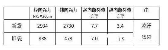 某燃煤熱電廠袋除塵器2013年3月開始運行,2014年1月發現大面積漏袋。東北大學濾料檢測中心通過對現場觀察、測試,并對現場采樣的濾袋進行實驗室測試,經一系列工作后,發現濾袋損壞主要是煙氣腐蝕所致。濾袋強力測試如下表: